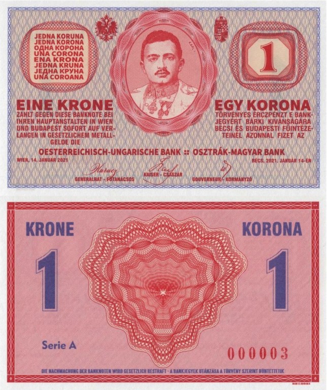 Pamětní tisk na počest Karla I. vyhotovený z originálního portrétu, na motiv vzácné bankovky 1 Krone 1914. Ochranné prvky: Ceninový papír s vodoznakem, UV vlákna, UV znak RU orlice, olejový číslovač s čísly 000001 až 000400.