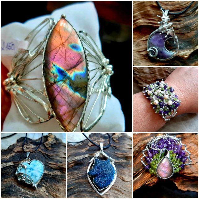 Šňůry minerálů a z nich vytvořené náhrdelníky a náramky nabízí na veletrhu každý rok Miloš Ferdus z firmy sperkystyl.cz. Vystavovatelka Saša Valinová vytvořila pro podzimní Minerály a drahé kameny mimo jiné selenitová srdíčka posílená drobnými luxusními kamínky, labradoritové skvosty a nebudou chybět ani oblíbení andílci.