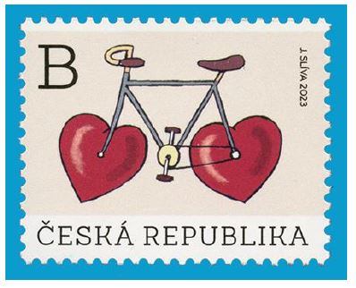 Jiří Slíva nakreslil také novou přítiskovou poštovní známku, kterou bude možné doplnit kuponem s vlastním motivem. Udělá radost především cyklistům, zejména těm, pro které – jak naznačuje samotná kresba – je kolo „srdeční záležitostí“.