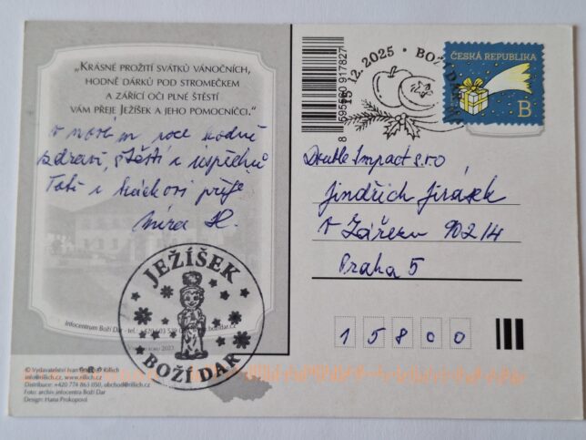 Z pošty na Božím Daru na Karlovarsku odešlo na konci roku přes 237 kilogramů poštovních zásilek s razítkem Vánoční pošty. Je to o více než 60 kilogramů přání méně než v roce 2024. Vánoční razítko pokaždé s jiným motivem se na vánoční přání na Božím Daru používá každoročně od 1. do 23. prosince od roku 1994. V průměru odbaví Ježíškova pošta každoročně okolo 300 kilogramů zásilek. Rekordním byl rok 2016, kdy na Božím Daru orazítkovali 386 kilogramů. Předloni odešlo 302 kilogramů zásilek, rok předtím o 49 kilogramů méně.