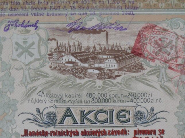 Deváté místo obsadila vzácná akcie pivovaru v Těšeticích z roku 1898 v nominální hodnotě 400 K, která se prodala za 8 000 Kč. Cenný papír pocházel z území českých zemí v době Rakousko-Uherska a je typickým předmětem pro obor skripofilie – sbírání historických akcií, dluhopisů a dalších listin. Staré listinné akcie jsou vyhledávány nejen pro svoji vzácnost a dekorativnost (využití v interiérech kanceláří, restaurací apod.), ale také jako hmatatelný doklad hospodářských dějin regionů. Aukro v této kategorii spolupracuje s Muzeem cenných papírů, které zde pravidelně vystavuje.