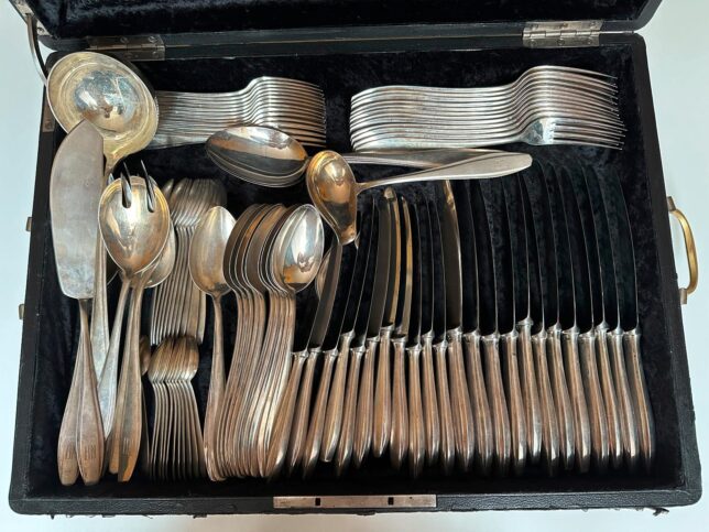 Za 115 000 Kč se prodala rozsáhlá sada starožitných příborů pro dvanáct osob z období první republiky. Celkem 92 kusů bylo uloženo v etui. Příbory byly značeny slovenským puncem a puncem pro cizí zboží platným v letech 1929–1941, s mistrovskou značkou FB (František Bibus). Celková hmotnost včetně nožů činila 5,351 kg (z toho nože 1,718 kg). Výsledek podtrhuje, že starožitné stříbrné stolní soupravy z meziválečného období jsou pro sběratele atraktivní nejen materiálem, ale i historickou a estetickou hodnotou.
