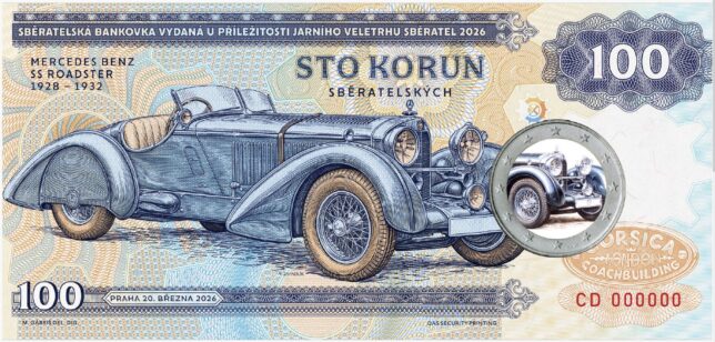Na jarním veletrhu Sběratel, který se koná 20. – 21. března, bude mít v hotelu Olympik Praha premiéru nová sběratelská bankovka ze Zlaté sbírky Václava Zapadlíka věnovaná “Legendárním karoseriím”. Mercedes-Benz SS (Super Sport) z dílny londýnské karosárny Corsica Coachbuilding patří dodnes mezi nejelegantnější vozy, které brázdily silnice.