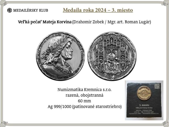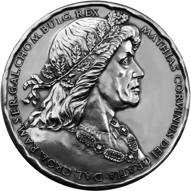 Třetí místo patří historizující medaili, která oslavuje osobnost Mateje Korvína, uherského a chorvatského krále a zakladatele univerzit v Bratislavě a Pešti.