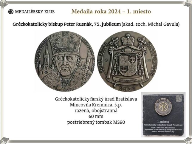 První místo si získala postříbřená medaile věnovaná řeckokatolickému biskupovi Petru Rusnákovi, duchovnímu pastýři bratislavské eparchie. Medaili vytvořil akademický sochař Michal Gavula (1954), známý i z loňska díky medaili se svatou Matkou Terezou z Kalkaty.