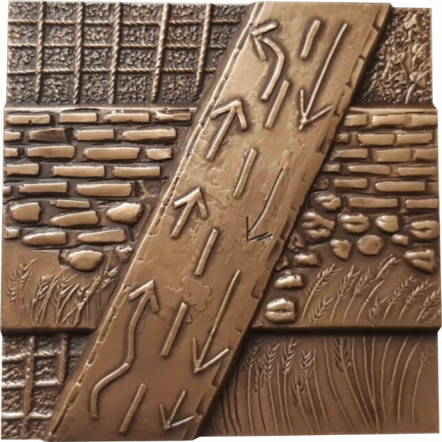 Plaketa má tvar čtverce a symbolicky propojuje pradávné počátky stavitelství s moderní infrastrukturou. Na jejím reliéfu se setkávají megalitická stavba, technické plány, silnice i vodní toky – zkrátka všechny disciplíny, které tvoří komplexní svět stavebního inženýrství.