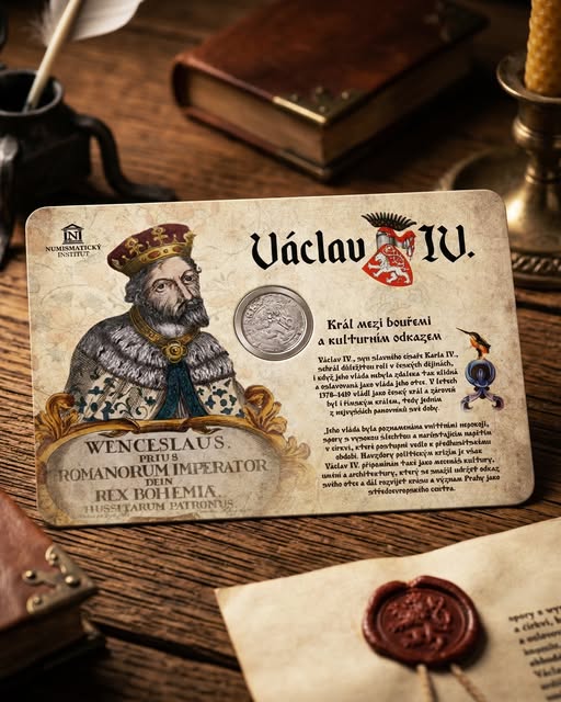 Slavnostní kartička s portrétem krále Václava IV. a vsazenou originální mincí – pražským grošem, jednou z nejznámějších mincí českého středověku, kdy české země patřily mezi významná centra středověké Evropy.