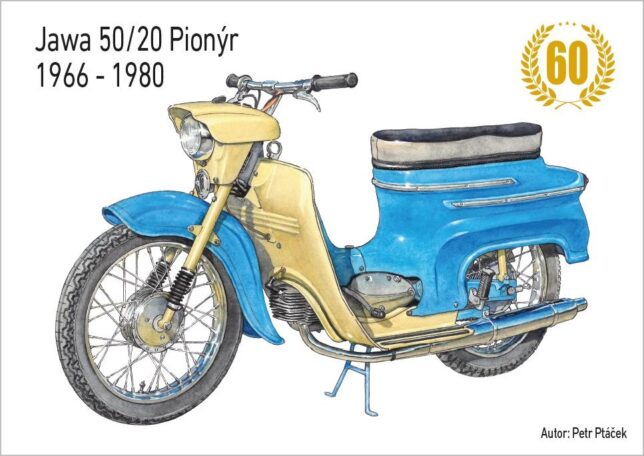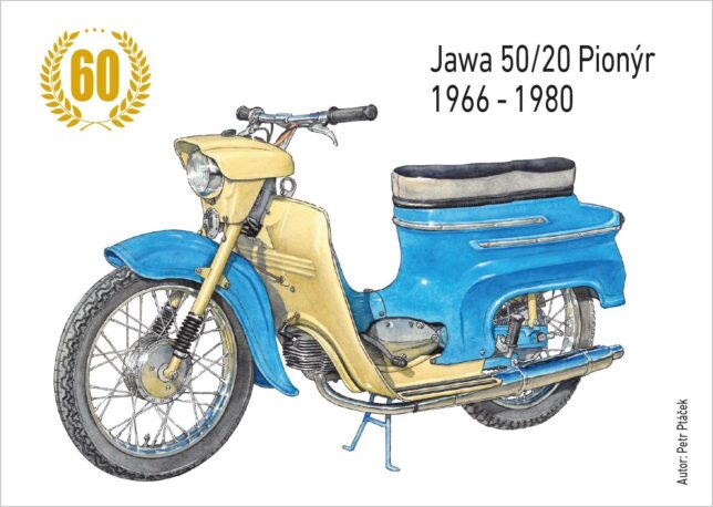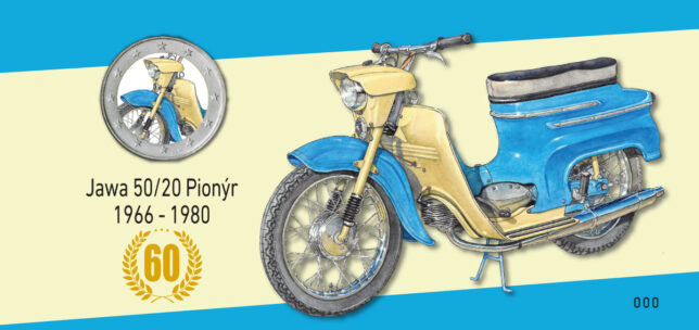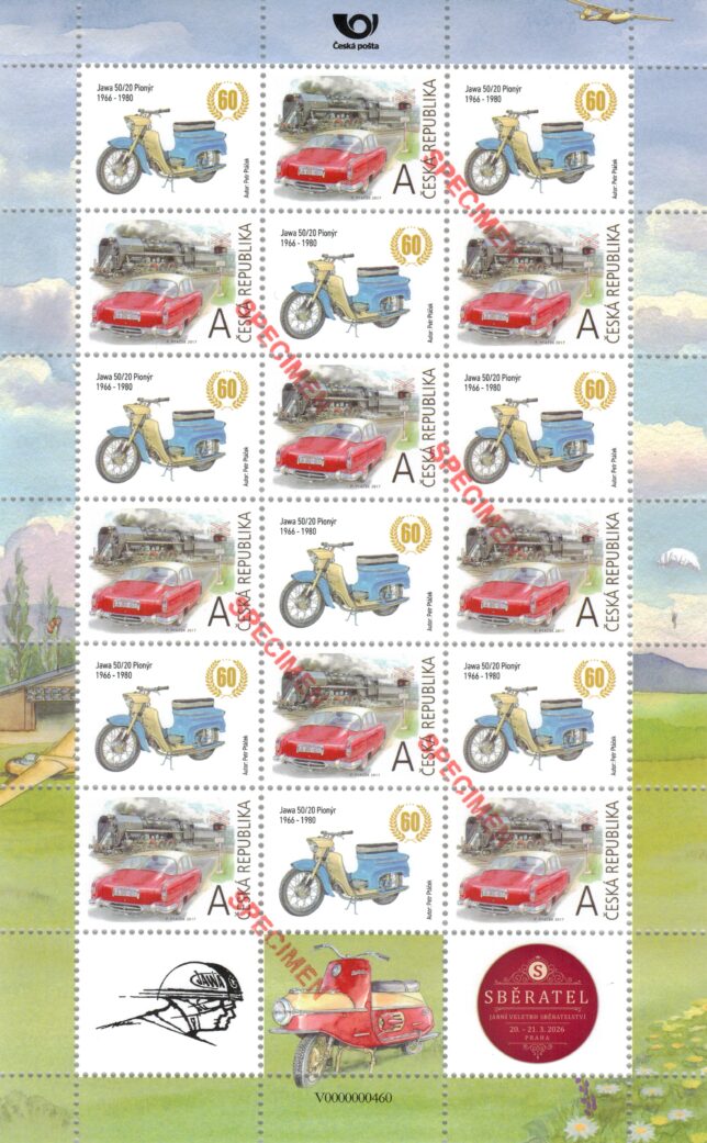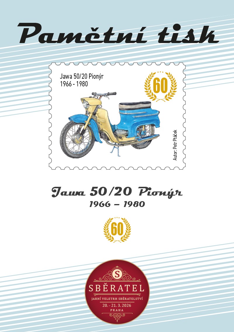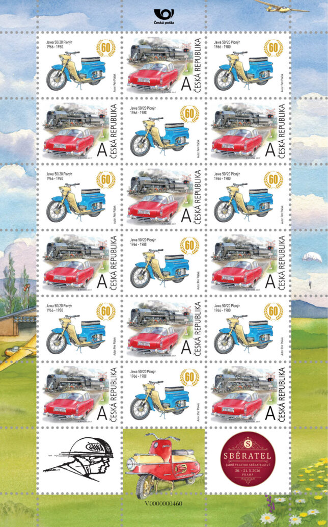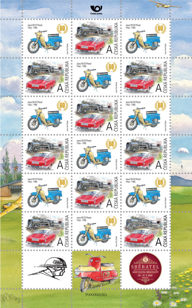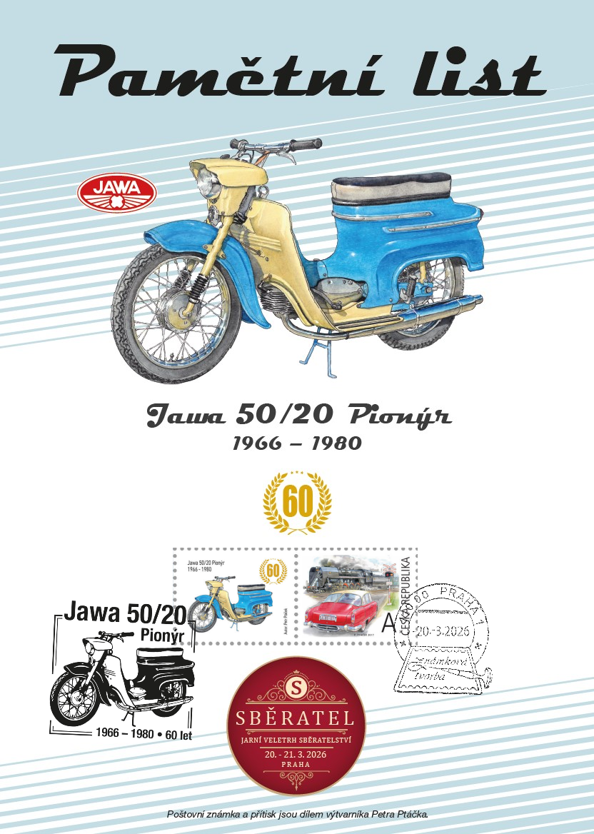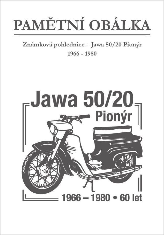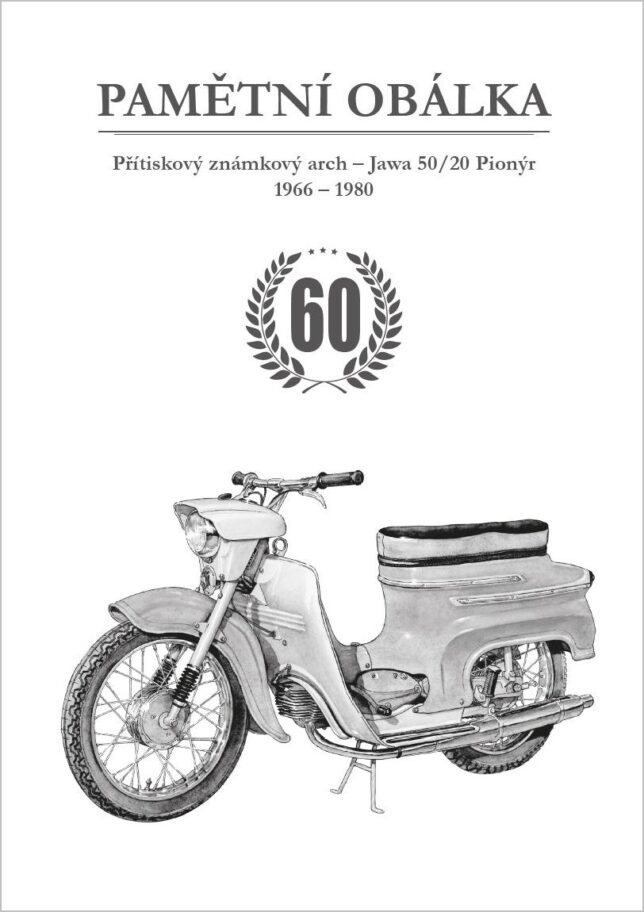 Sběratelský přítiskový arch “Jawa 50/20 – 60 let”. Pamětní arch vydaný u České pošty jako řada V tvoří devět poštovních známek s nominále „A“. Autorem kresby je výtvarník Petr Ptáček. Tištěno v tiskárně poštovních známek v Hradištku.