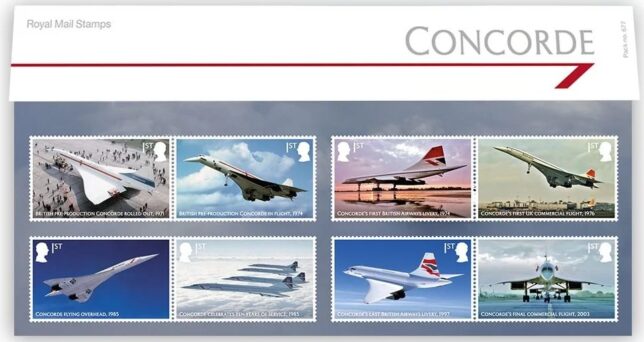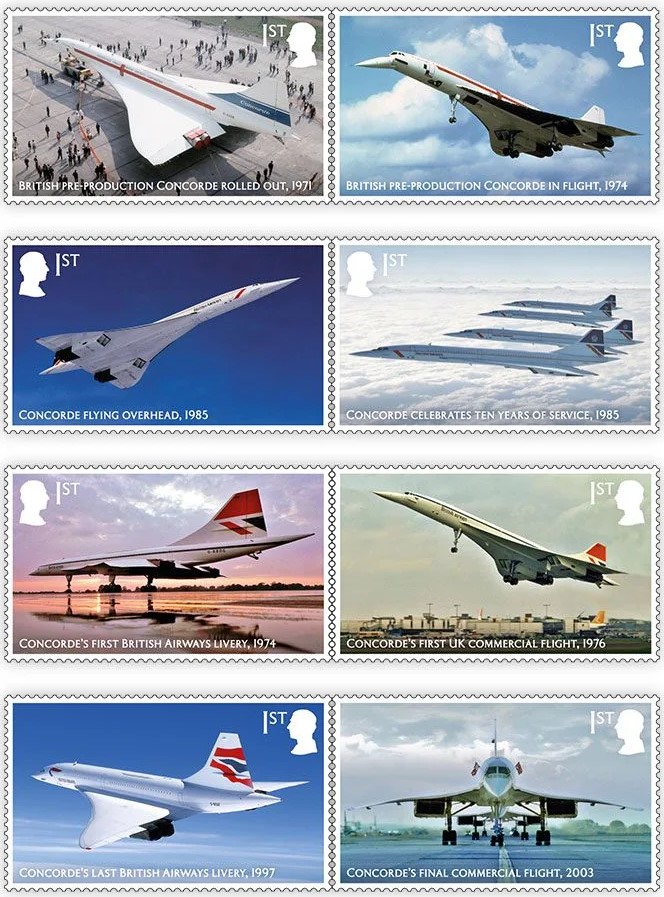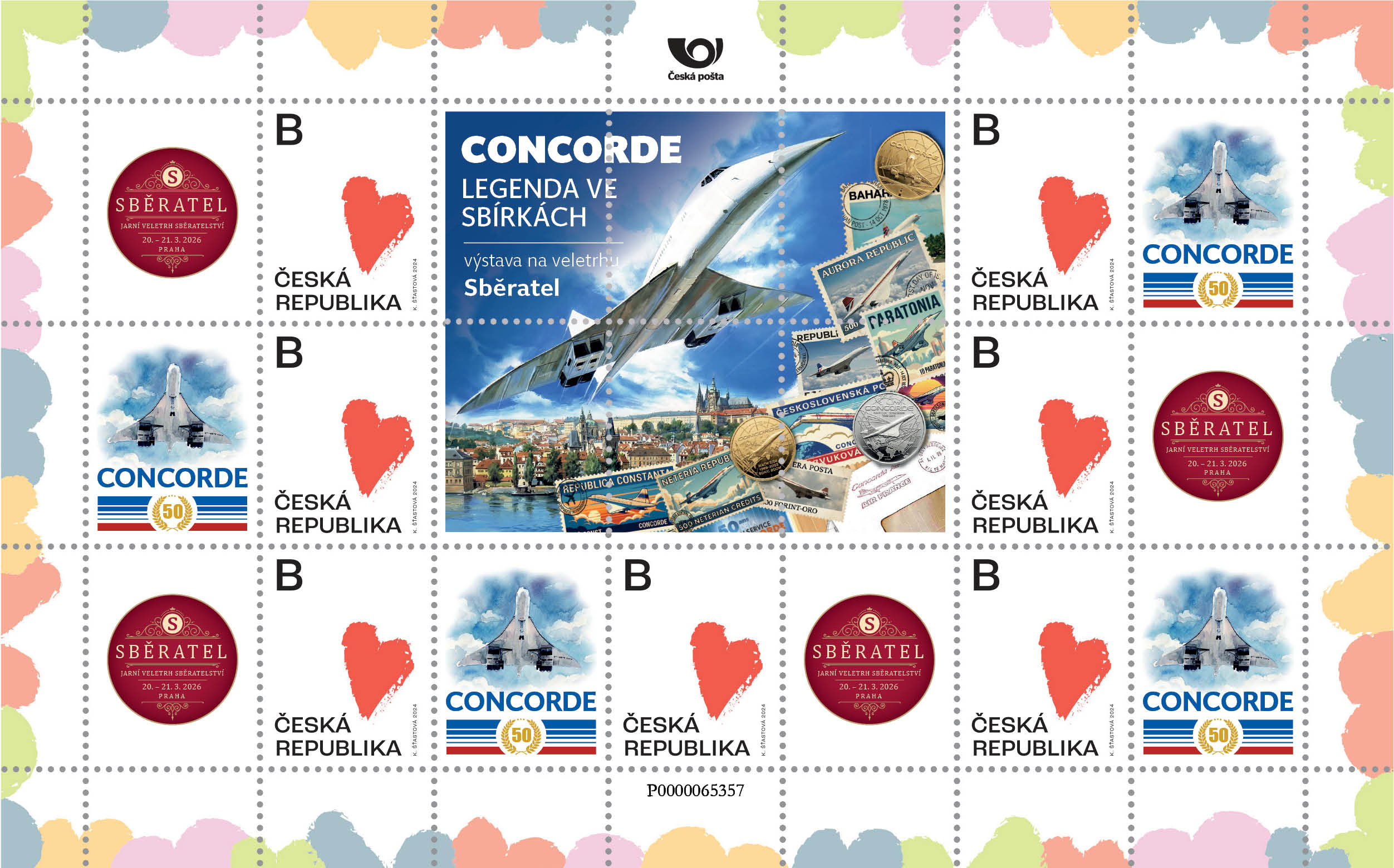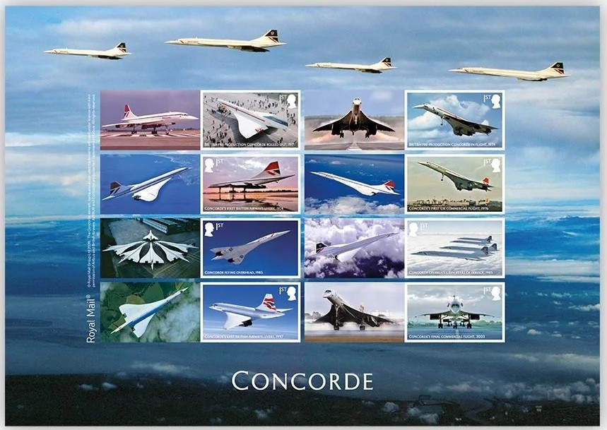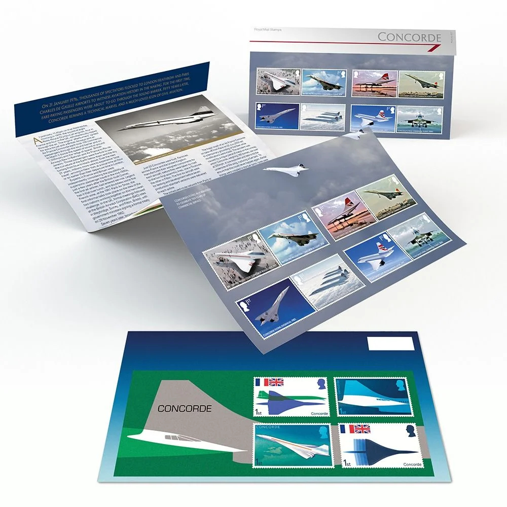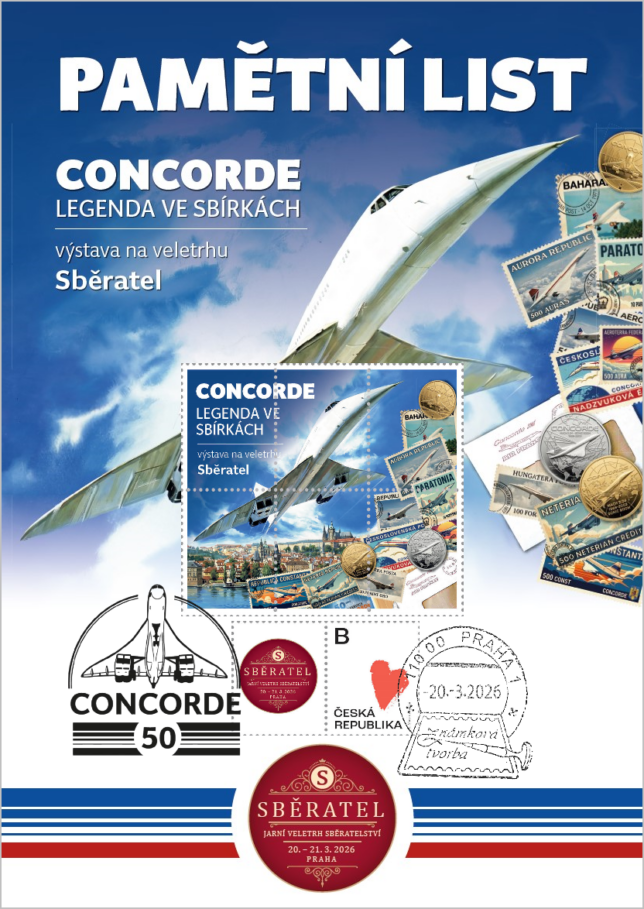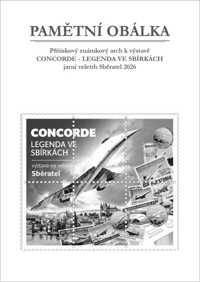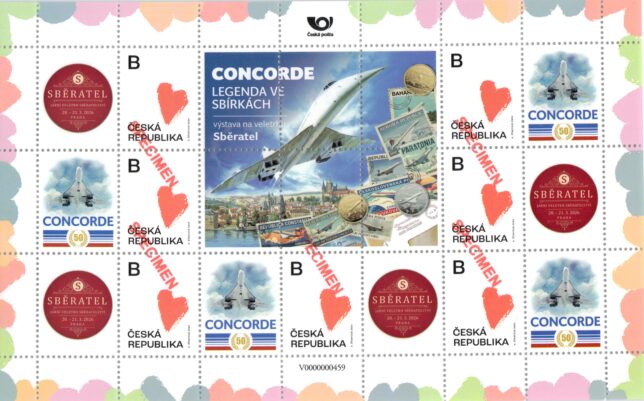 Sběratelský přítiskový arch “Concorde – 50 let”. Pamětní arch vydaný u České pošty jako řada V tvoří sedm poštovních známek s nominále „B“. Tištěno v tiskárně poštovních známek v Hradištku.