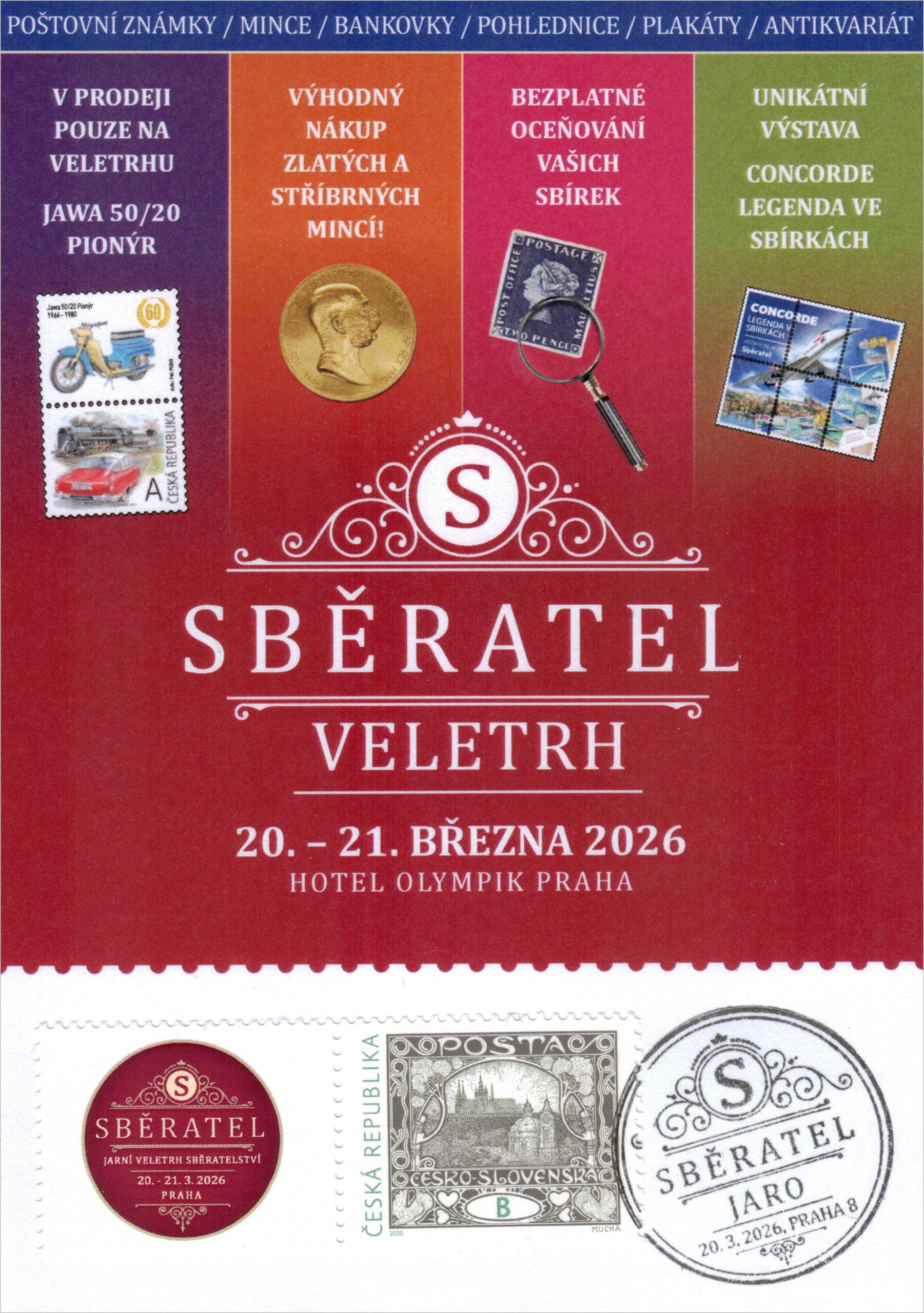 Pamětní dopis se zpáteční adresou jarního veletrhu Sběratel v hotelu Olympik Praha s příležitostným kašetem. Poštovní známka je oražena razítkem známkové tvorby s datem 20. 3. 2026, tedy první den veletrhu. Přítisk je oražen kašetem.