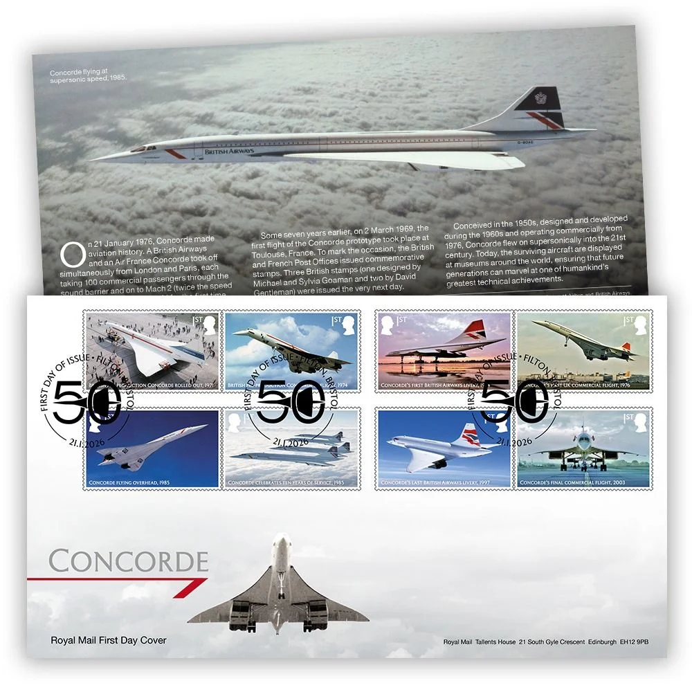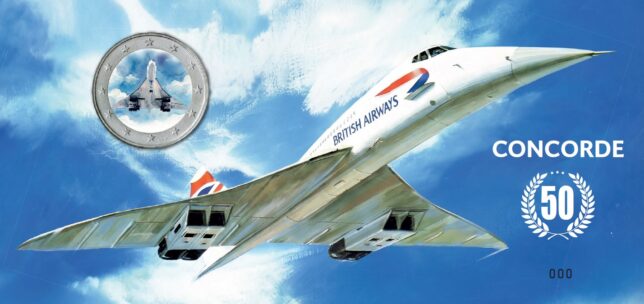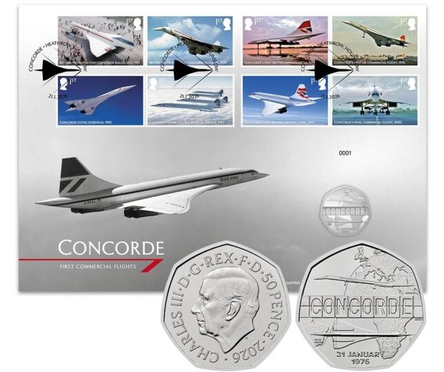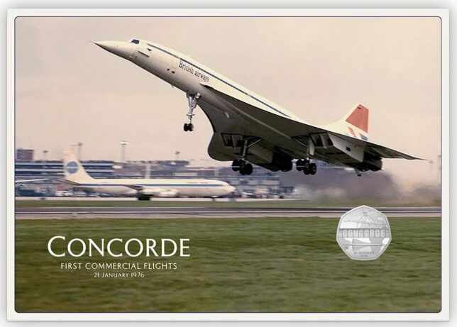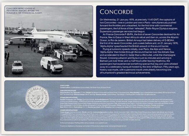 Číslovaná mincovní obálka je vylepena osmi známkami vydanými Britskou poštou a oražena příležitostným razítkem. Obsahuje pamětní minci s Concordem v hodnotě 50 pencí. Kopr-nikl, průměr 27,3 mm.