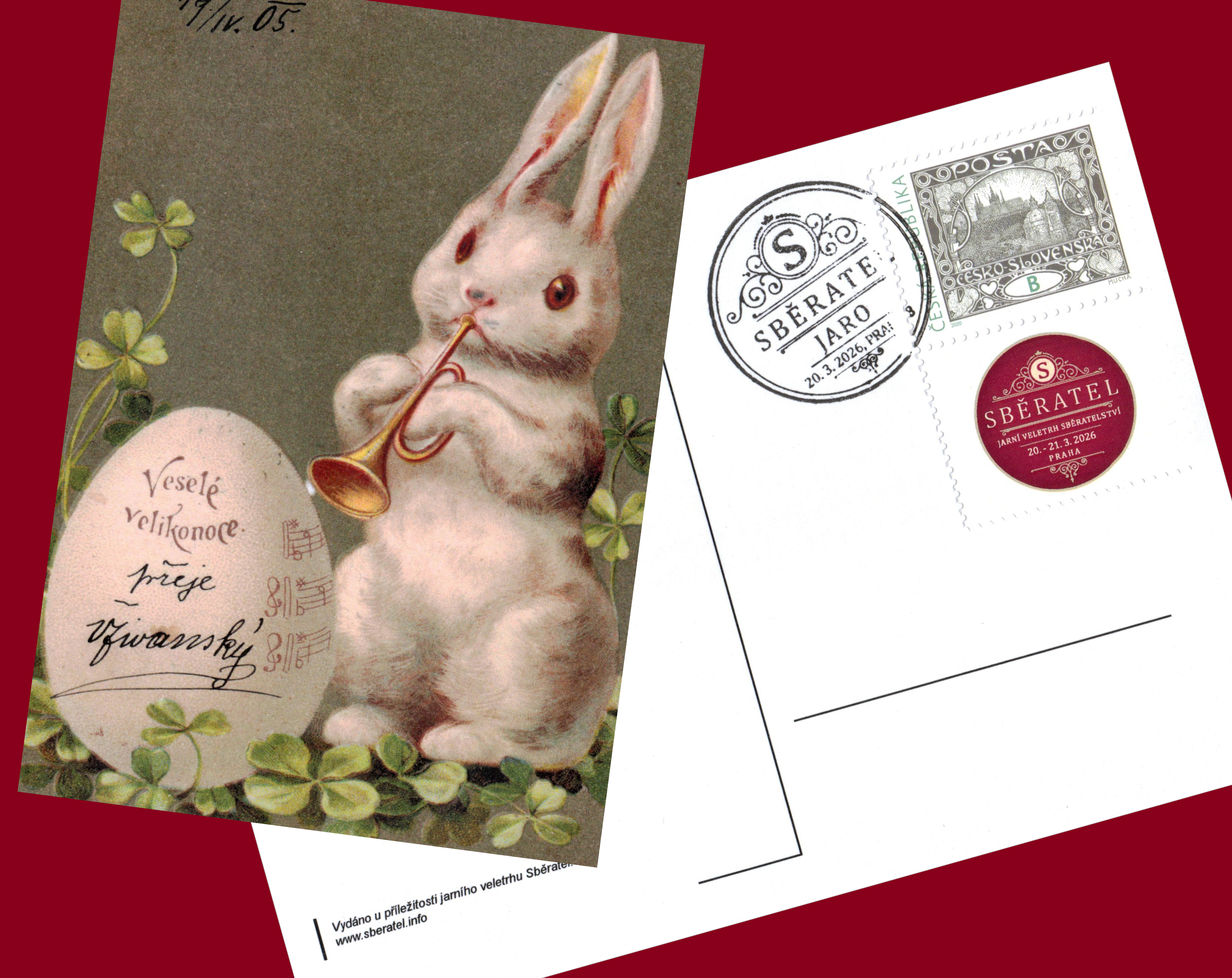Pohlednice s motivem Velikonoc je na zadní straně vylepena známkou s přítiskem jarního veletrhu Sběratel a oražena příležitostným razítkem České pošty Prahy 8, jež bylo první den veletrhu k dispozici ve voze mobilní pošty.