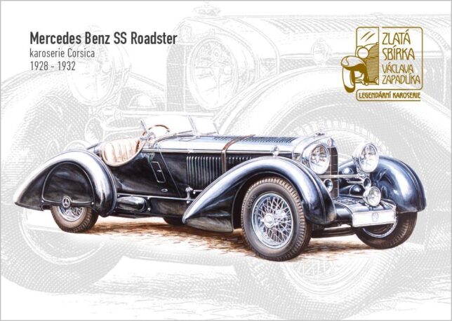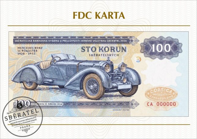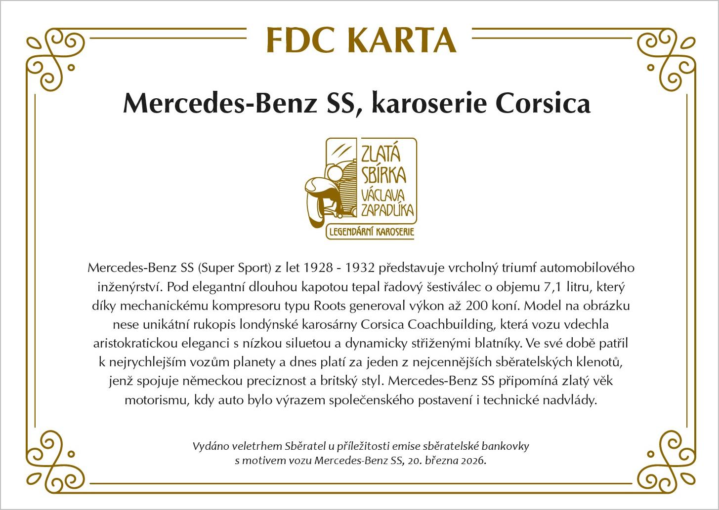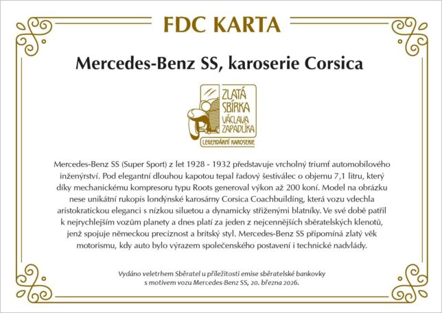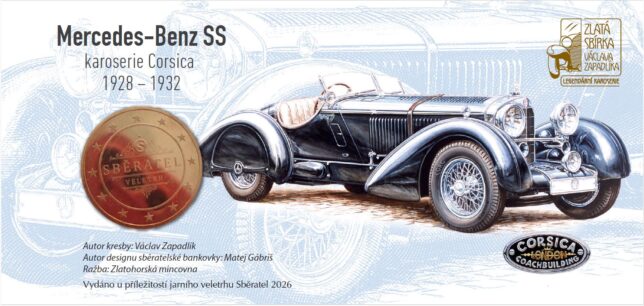 Pamětní obálka k nové sběratelské bankovce z edice Zlatá sbírka Václava Zapadlíka „Legendární karoserie“ s vyobrazením automobilu Mercedes-Benz SS s karoserií Corsica.