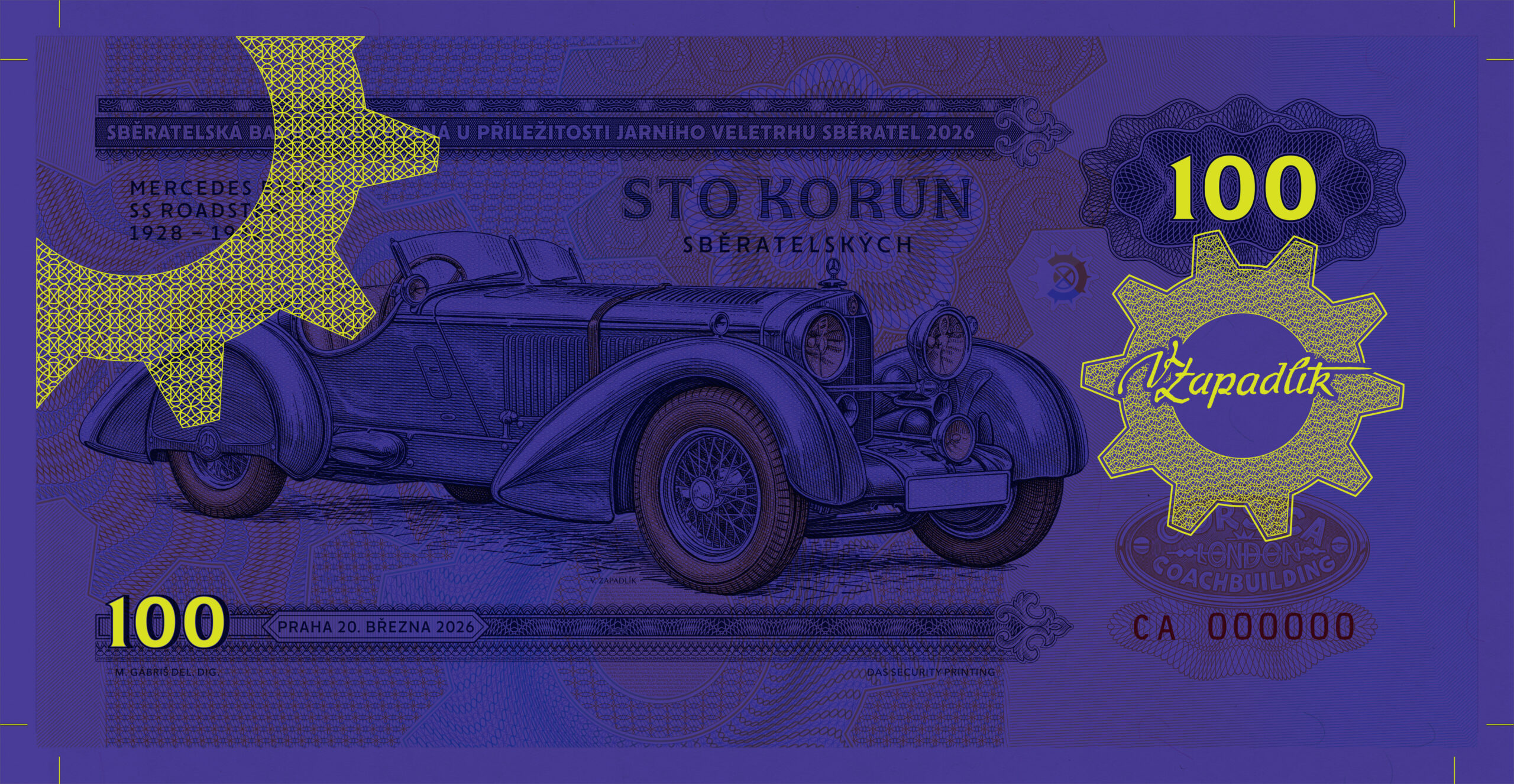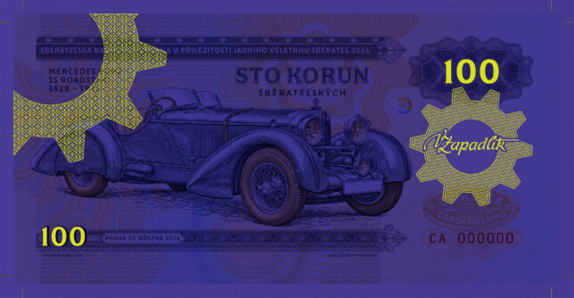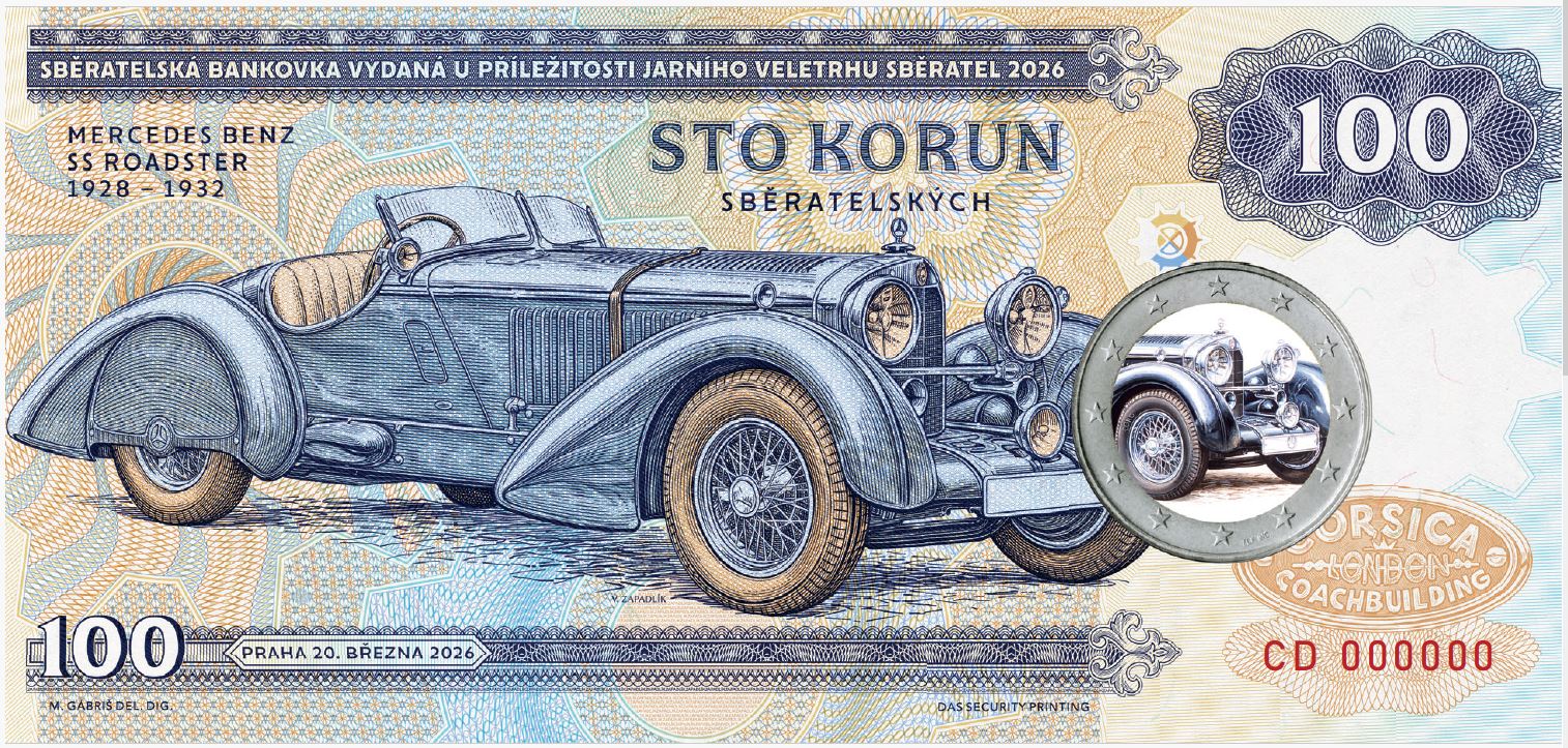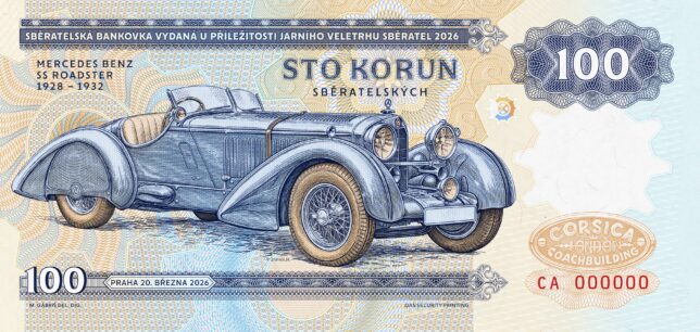 Nová sběratelská bankovka z edice Zlatá sbírka Václava Zapadlíka „Legendární karoserie“ s vyobrazením automobilu Mercedes-Benz SS s karoserií Corsica série CB určená pouze pro členy Klanu sběratelů. Série CC pro volný prodej.