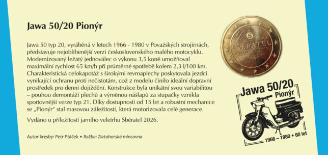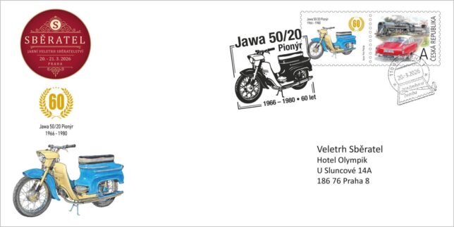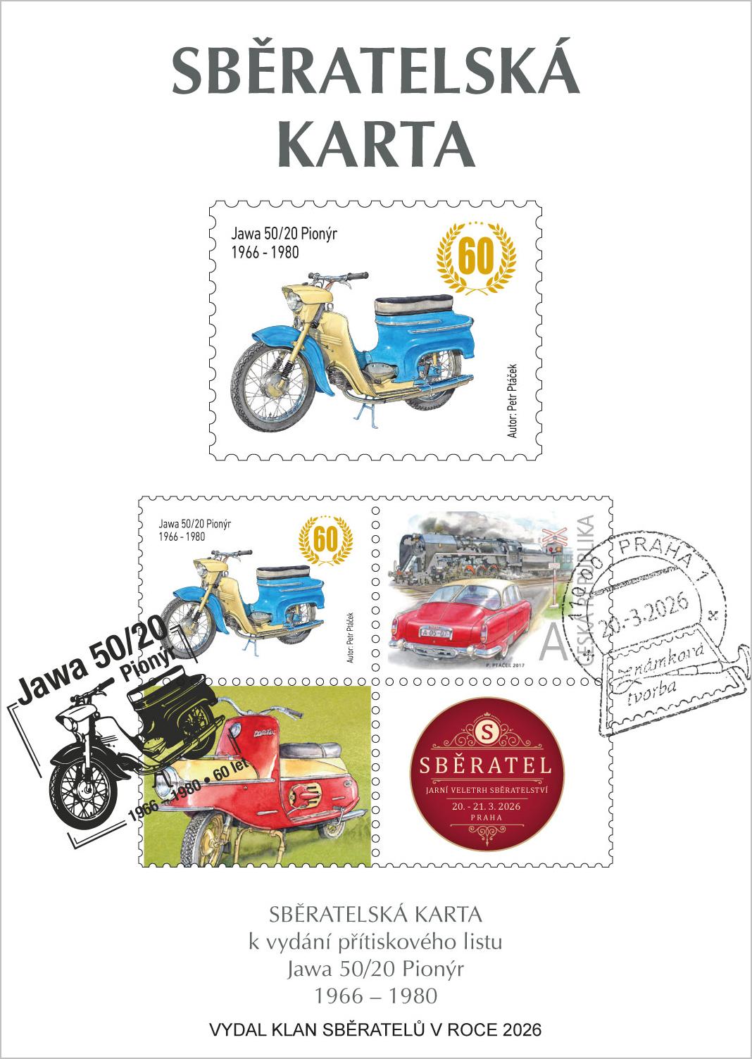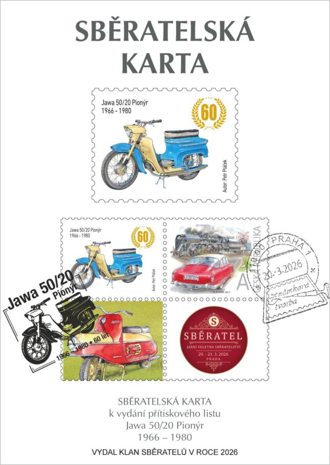 Sběratelská karta určená pouze pro členy Klanu sběratelů se dvěma kupony České pošty, přítiskovou poštovní známkou a předtištěným kuponem s vyobrazením motocyklu Jawa 50/20. Poštovní známka je oražena razítkem známkové tvorby s datem 20. 3. 2026, tedy první den veletrhu.první den veletrhu.