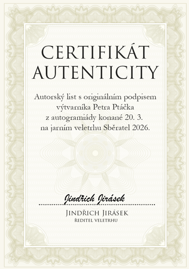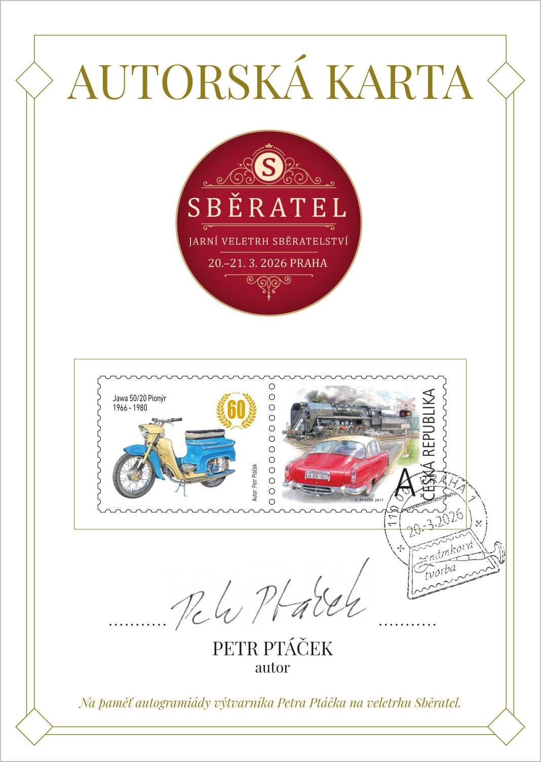 Autorská karta veletrhu Sběratel s vylepenou poštovní známkou a přítiskovým kuponem s originálním podpisem jeho autora Petra Ptáčka. Poštovní známka je oražena razítkem známkové tvorby s datem 20. 3. 2026, tedy první den veletrhu.
