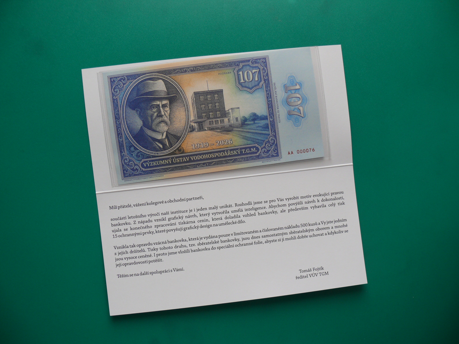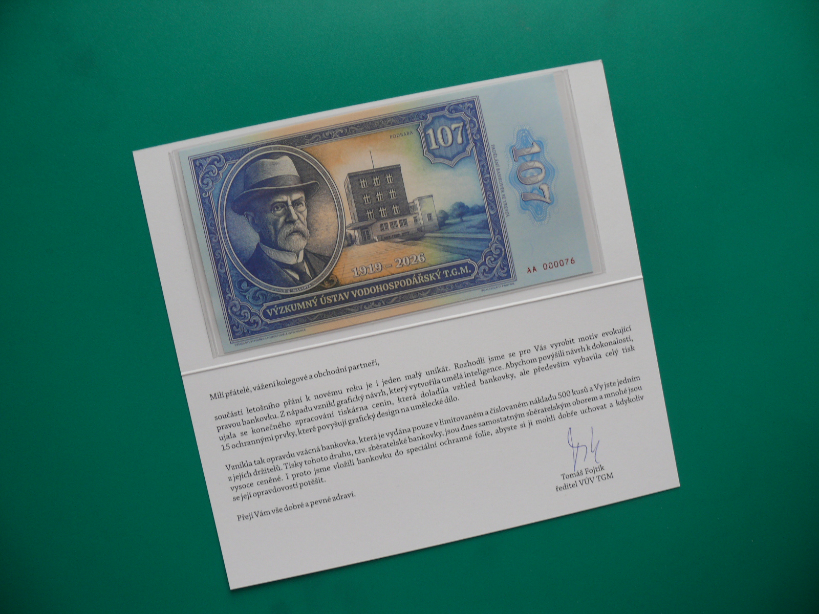 Motiv vytvořila umělá inteligence, tiskárna pak přidala ochranné a ceninové prvky. Celkem bylo vyrobeno pouze 500 kusů, z toho 300 ks verze “PF” (okrový folder s podpisem ředitele VŮV TGM) a 200 ks (modrý), tzv. celoroční folder.