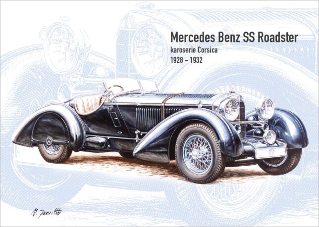 Plechová cedule s motivem automobilu Mercedes-Benz SS s karoserií Corsica ze Zlaté sbírky Václava Zapadlíka „Legendární karoserie“.