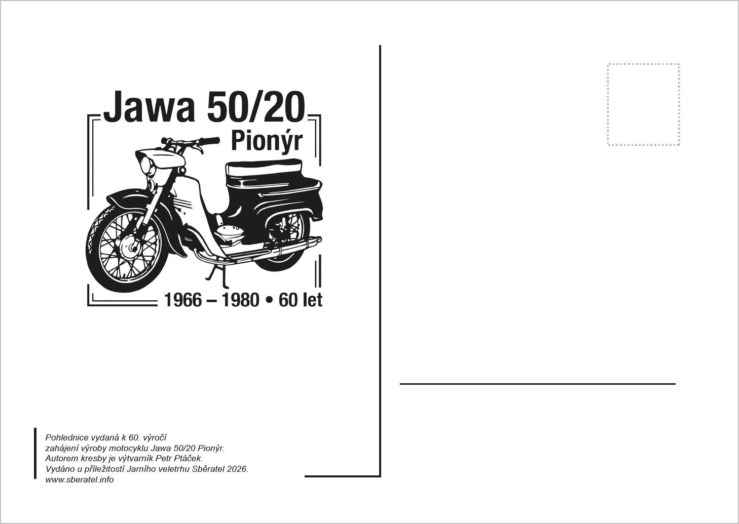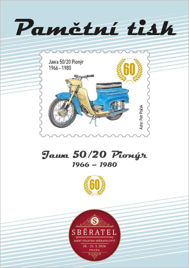 Pamětní tisk k 60. výročí od zahájení výroby motocyklu Jawa 50/20 s logem jarního veletrhu Sběratel a motivem přítiskového kuponu, který měl na veletrhu premiéru. Formát A5.