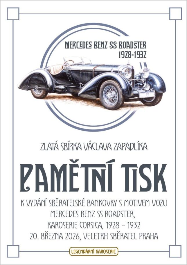 Pamětní tisk připomínající premiéru nové sběratelské bankovky z edice Zlatá sbírka Václava Zapadlíka „Legendární karoserie“ s vyobrazením automobilu Mercedes- Benz SS.
