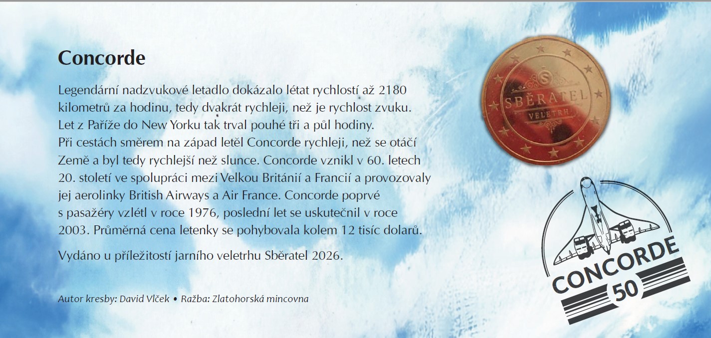 Pařížská mincovna vydává v roce 2026 sběratelskou minci k 50. výročí zahájení provozu nadzvukového letounu Concorde, navrženou ve spolupráci s kreslířem Romainem Hugaultem. Design mince originálně propojuje siluetu Concordu s Eiffelovou věží, přičemž připomíná jak technologický triumf, tak komerční ukončení provozu v roce 2003.