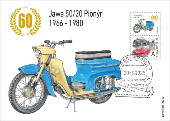 Pohlednice s vylepenou poštovní známkou České pošty a kuponem s vyobrazením motocyklu Jawa 50/20 Pionýr. Poštovní známka je oražena razítkem známkové tvorby s datem 20. 3. 2026, tedy první den veletrhu.