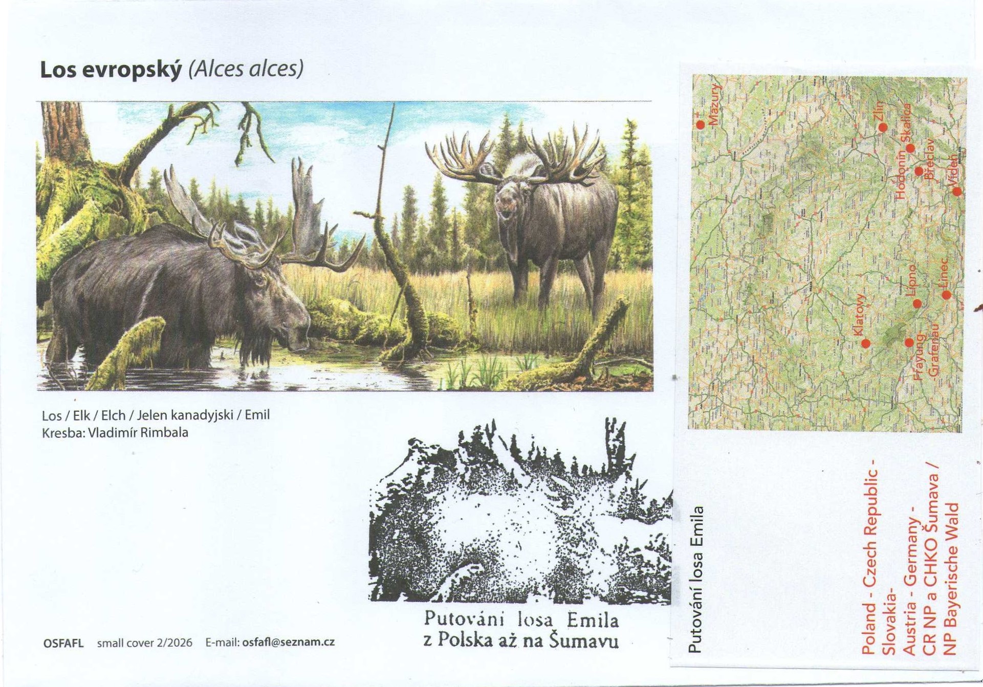 Obálka s razítkem – kašetem, samolepkou jeho putování (mapa). Vše se váže k loňskému putování losa Emila, který prošel několika státy, až snad zakotvil v Šumavském národním parku či v Německu v Bayerische Wald.